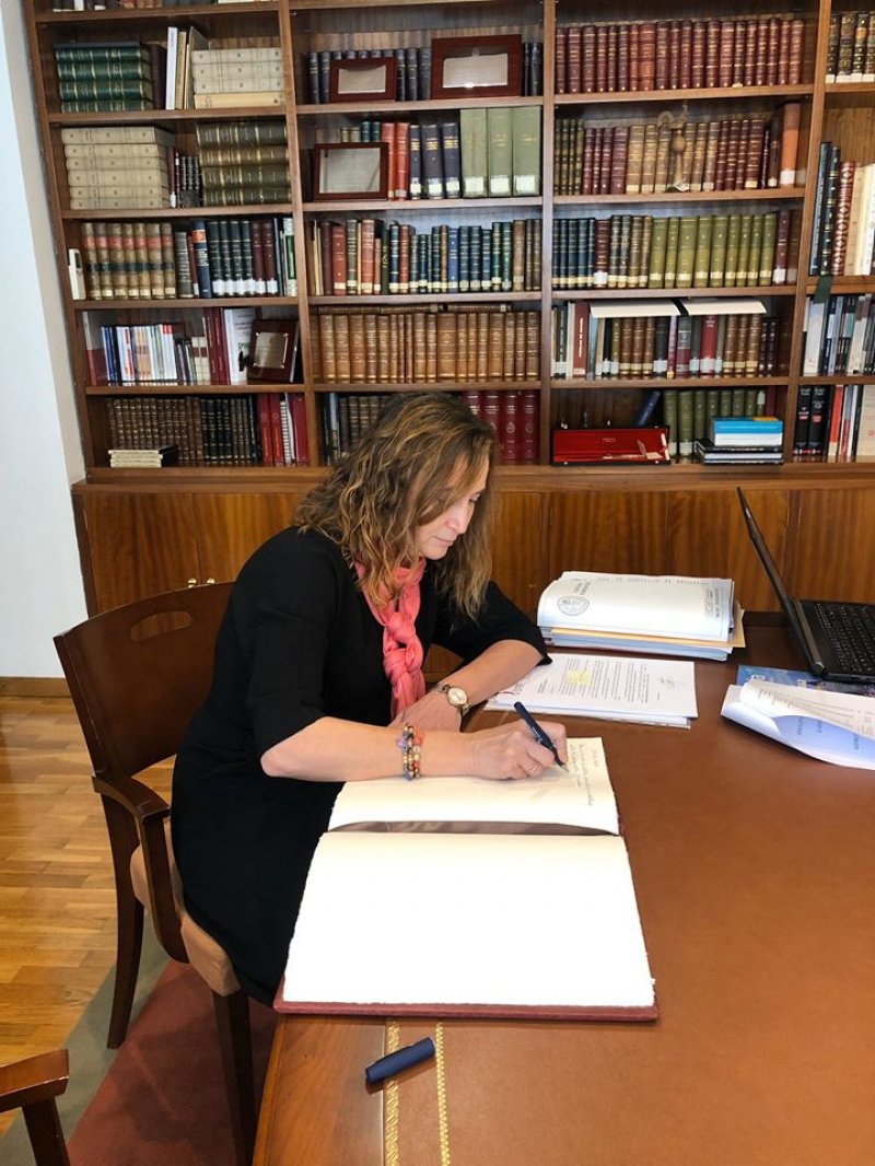 La nueva General del INCIBE, quien firmó en el Libro de Honor del Colegio de Abogados de León, fue recibida por el Decano, Fernando Rodríguez Santocildes, y la Diputada responsable de Nuevas Tecnologías, Laura Fra Rodriguez.
